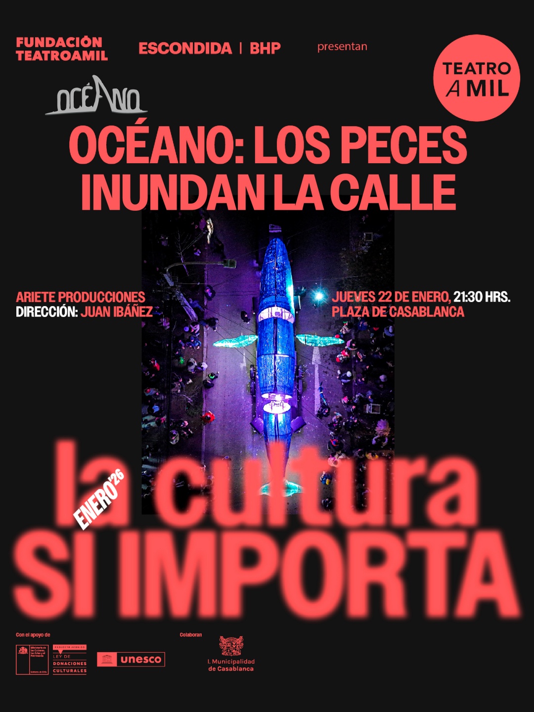 La primera función será “Océanos: los peces inundan la calle” de Ariete Producciones, teatro de calle que traerá cardúmenes de peces y mamíferos acuáticos que inundarán Casablanca en un show de luces y colores vibrantes el próximo jueves 22 de enero a las 21:30 horas en la Plaza de Armas.