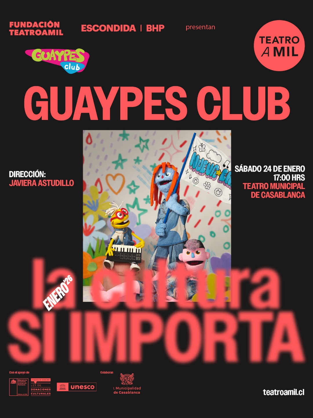 La segunda propuesta “Guaypes Club”, es una banda de música dedicada a la niñez, interpretada por marionetas cantantes de trap y reggaeton consciente, con un profundo deseo: cambiar el mundo y llenarlo de amor, y se presentarán el sábado 24 de enero a las 17:00 horas en el Teatro Municipal. Retiro de entradas a partir del lunes 19 de enero en la Oficina de Relaciones Públicas.